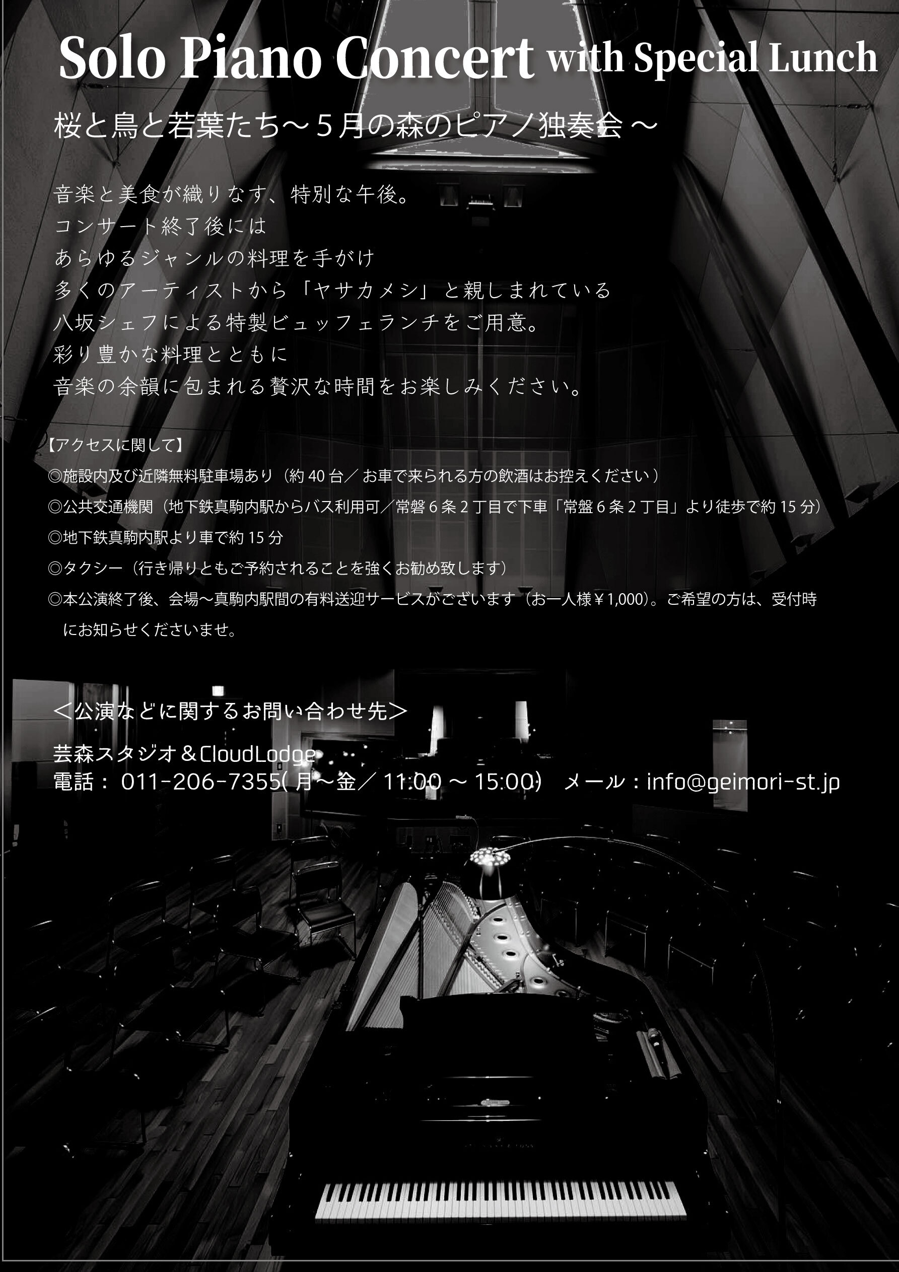 ◎本公演終了後、会場~真駒内駅間の有料送迎サービスがございます(お一人様¥1,000)。ご希望の方は、受付時にお知らせくださいませ。